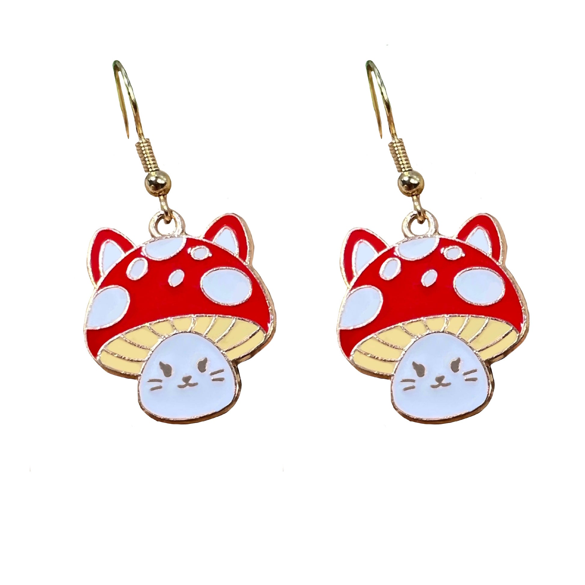 These delightful earrings are lightweight and measure half an inch. They are detailed with a cute little cat face with mushroom ears. Earrings are nickel and lead-free. Outlined in gold, with white and red enamel.