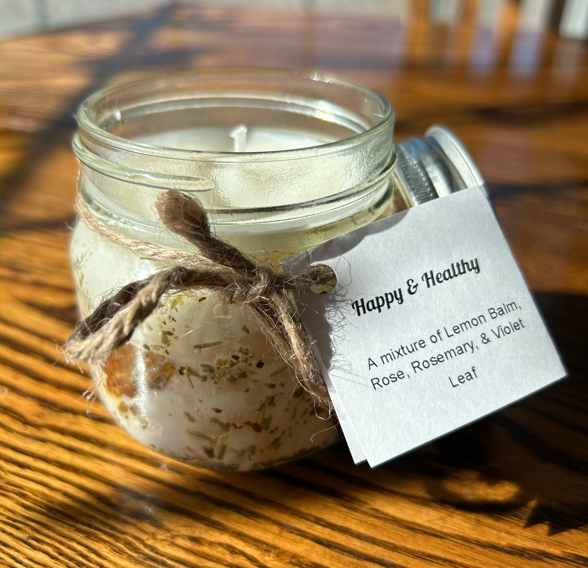 - Happy & Healthy candles include: Lemon Balm, Rose, Rosemary, & Violet Leaf