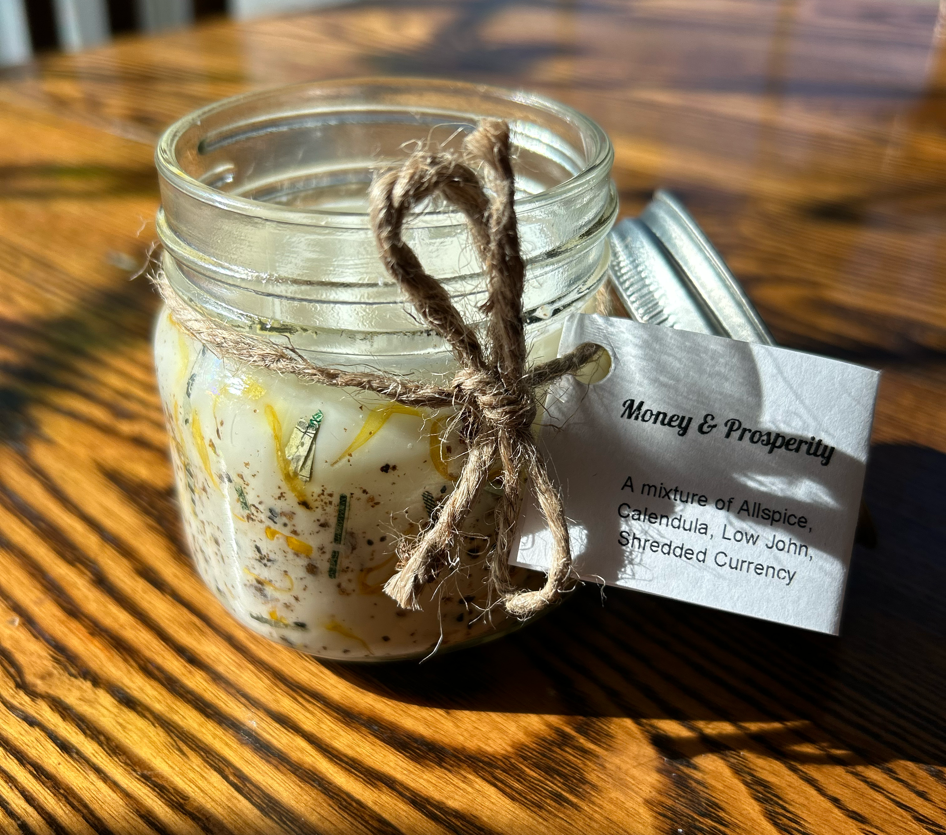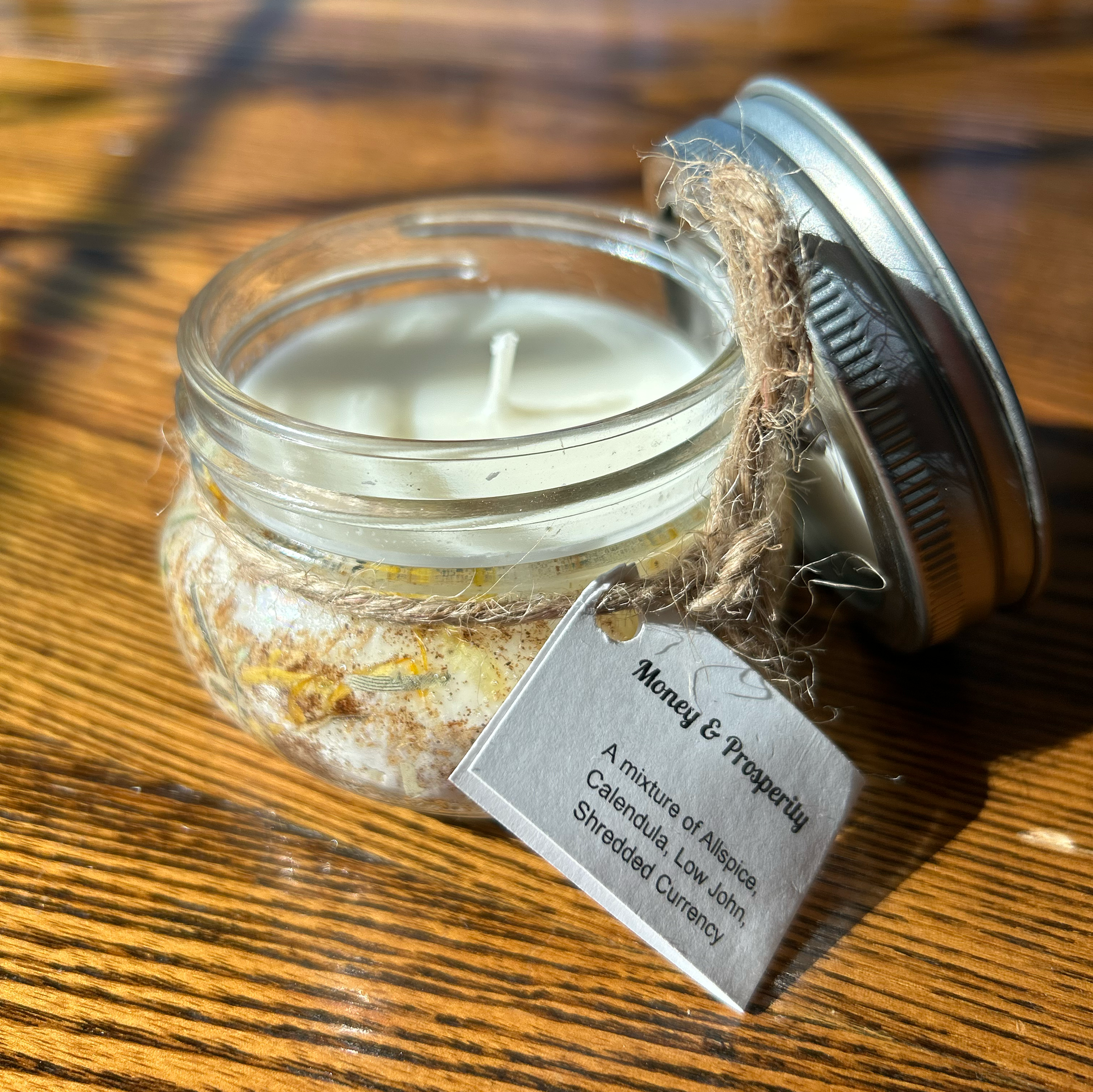 - Money & Prosperity candles include: Allspice, Calendula, Low John, & Shredded Currency